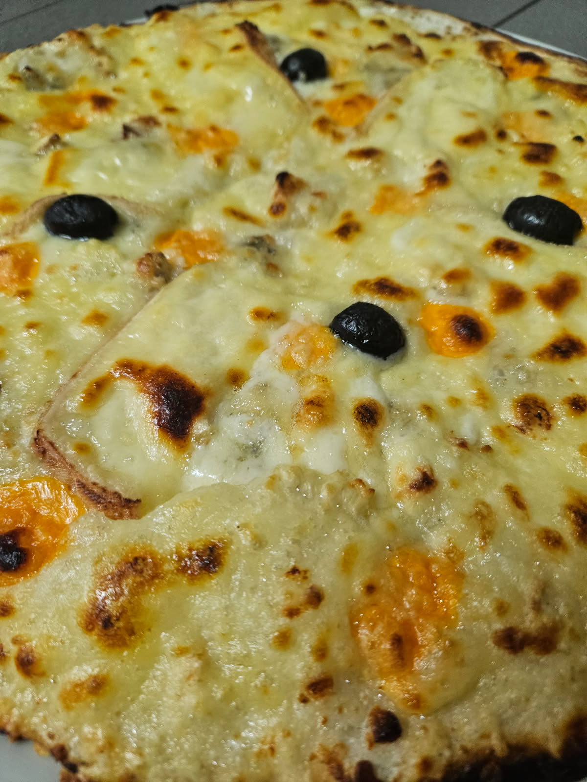 La 7 fromages : crème, gorgonzola, chèvre, reblochon, raclette, mimolette, mozzarella, emmental râpé, olives. 16€